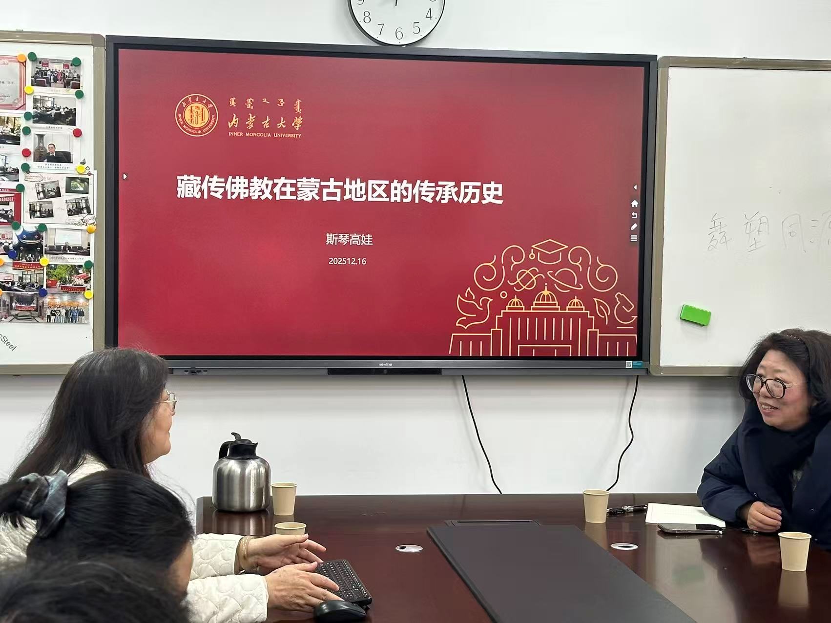 2025年12月16日下午3点,四川大学道教与宗教文化研究所2025年度宗教文化论坛第10讲在望江校区文科楼223会议室举行,本次讲座主题为“藏传佛教在蒙古地区的传承历史”。内蒙古大学统战部部长斯琴高娃教授主谈,四川大学道教与宗教文化研究所闵丽教授主持。四川大学道教与宗教文化研究所吴华副研究员,以及本所博士生、硕士生出席讲座并参加了讨论。现场氛围热烈,座无虚席。