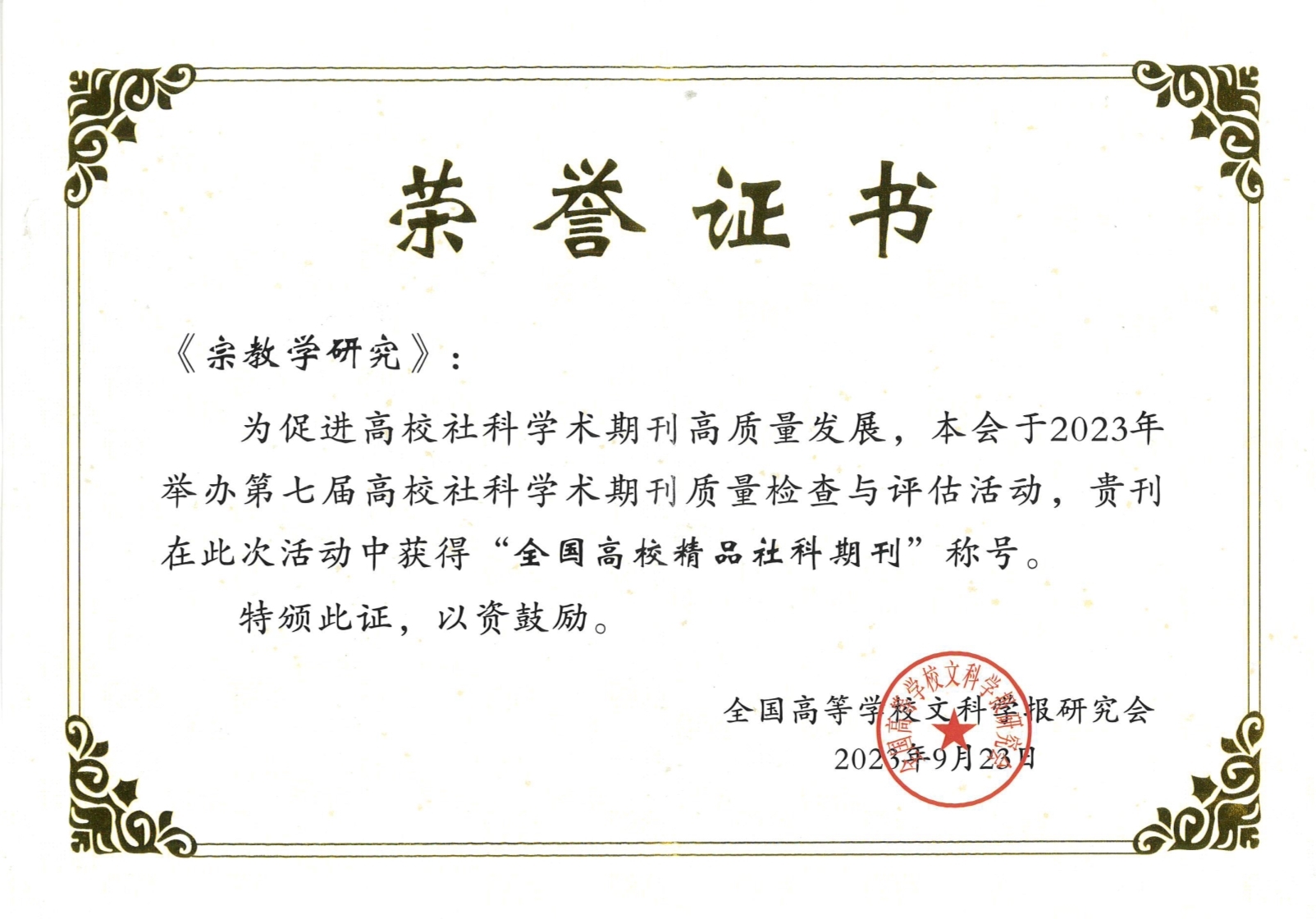 《宗教学研究》荣获“全国高校精品社科期刊”称号