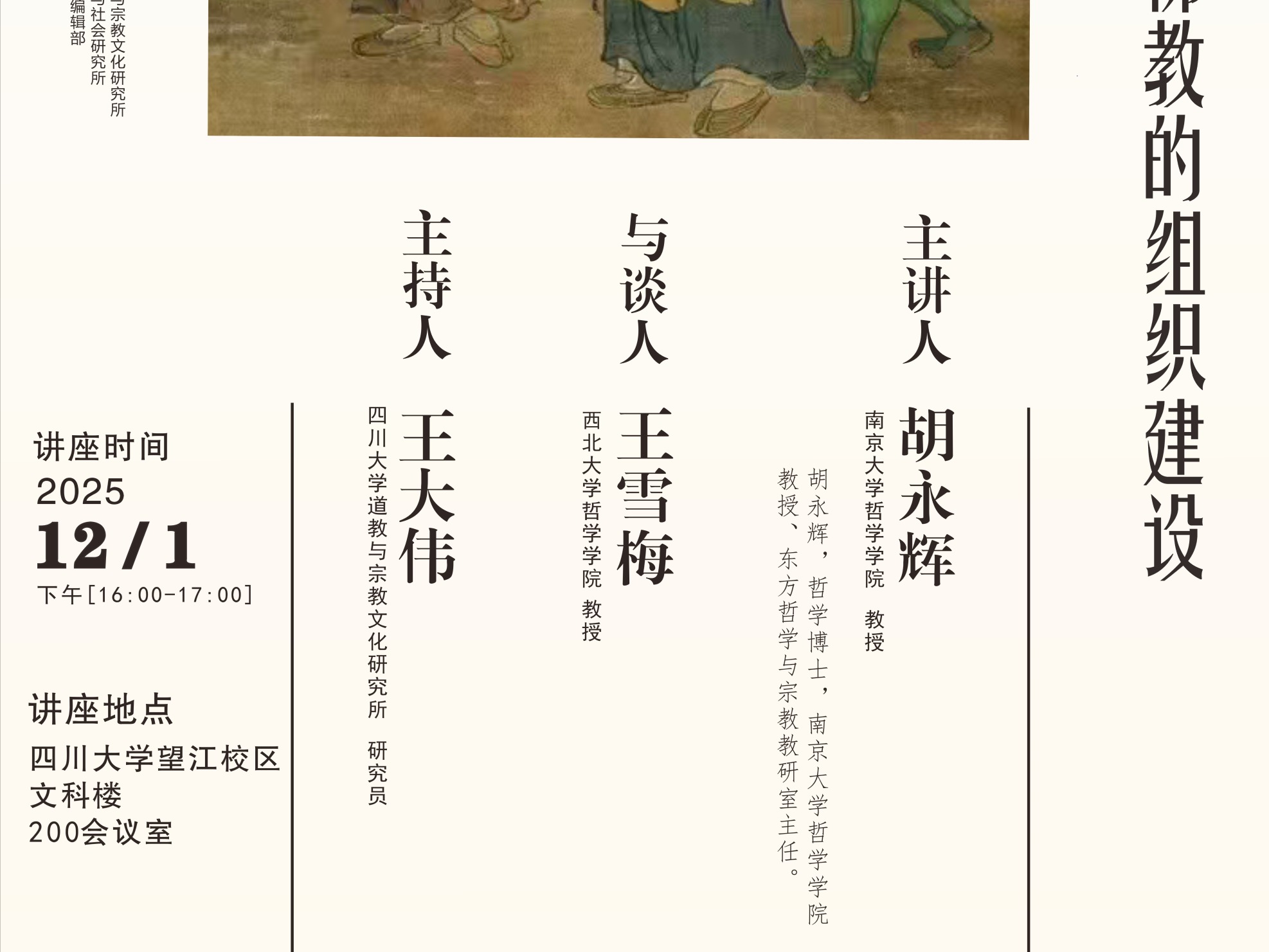 2025年11月20日晚上7点至9点,四川大学宗教文化论坛宗教工作特色智库系列讲座第4讲在文科楼200号会议室举行,本场讲座主题为“中国化宗教学三大体系建设”。中国社会科学院世界宗教研究所研究员卓新平老师主讲,四川大学道教与宗教文化研究所研究员李裴老师主持。出席讲座的还有我所田海华教授与胡瀚霆副教授,外国语学院的刘瑞云教授,文新学院的完德加教授以及成都大学的梁栋老师。讲座现场学术气氛热烈。讲座伊始,卓老师便...