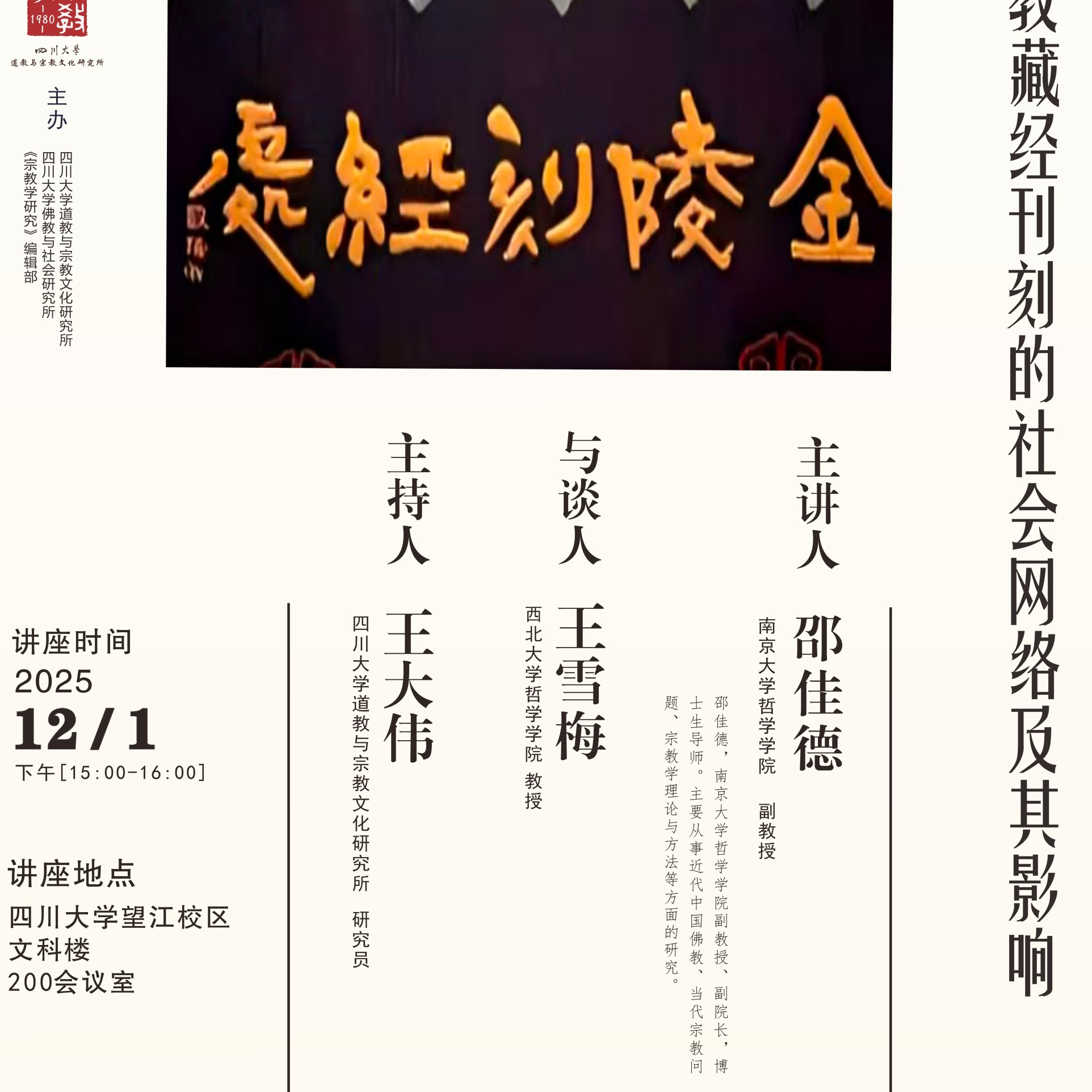 2025年12月1日下午3时,应四川大学道教与宗教文化研究所邀请,南京大学哲学学院邵佳德副教授在望江校区文科楼200会议室作了题为“近代中国佛教藏经刊刻的社会网络及其影响——以常州天宁寺为中心”的学术讲座。此次讲座为“佛教思想与社会”系列讲座第22讲,由四川大学道教与宗教文化研究所王大伟研究员主持,西北大学哲学学院王雪梅教授担任评议人。参加讲座的还有李翎、吴华老师,以及本所的硕、博士研究生。讲座现场学术气氛...