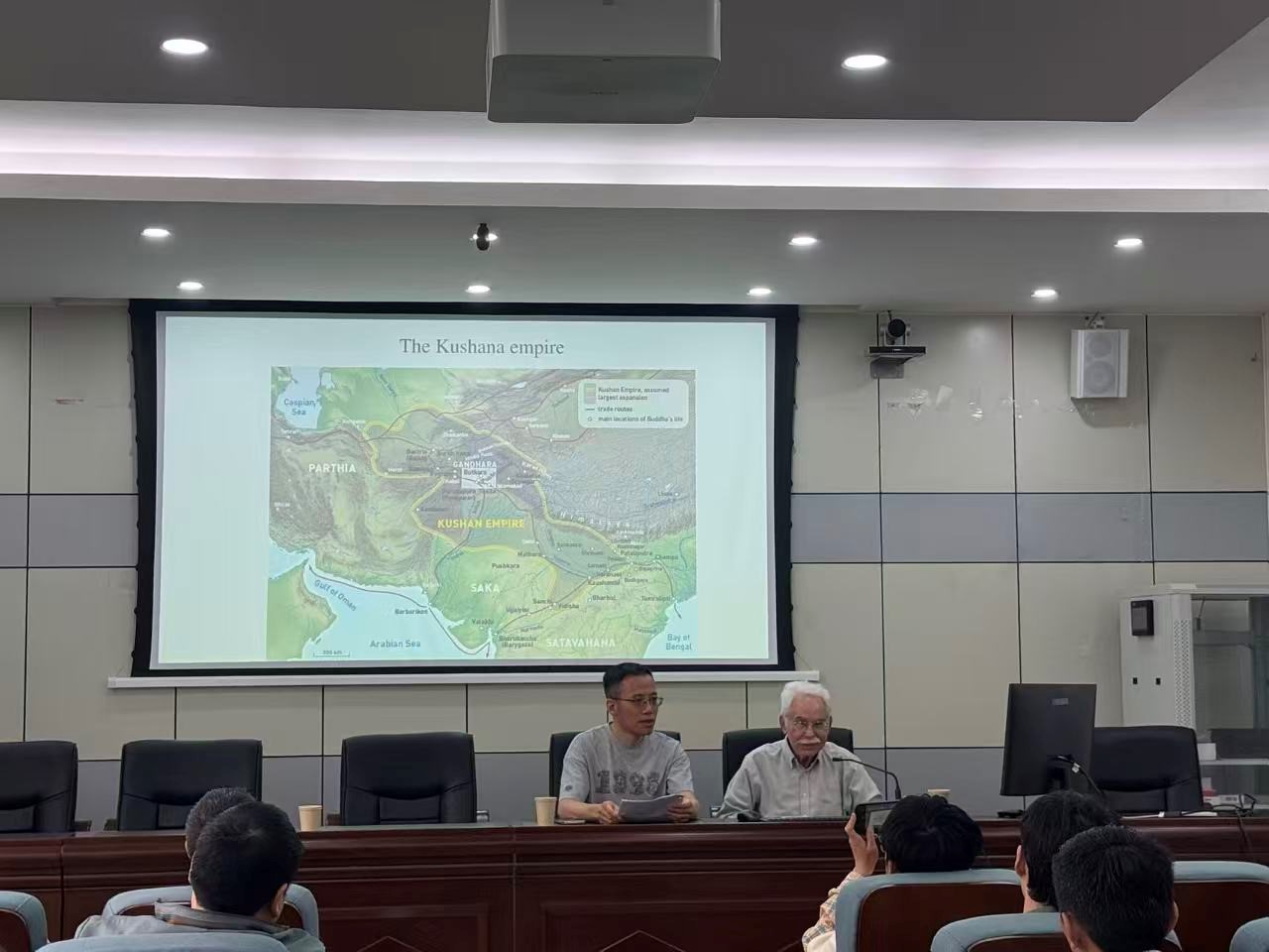 讲座伊始,邵瑞琪教授首先介绍了公元1至2世纪欧亚四大帝国(东汉、贵霜、帕提亚、罗马)的地理格局,指出贵霜王朝留下的历史资料最为稀少,贵霜第二世国王威玛·塔克图长期不为学界所知。随后,他梳理了贵霜王系年表,并说明威玛·塔克图的历史地位通过三组考古材料得以确认:马图拉雕像(1911年发现,底座刻有王名但迟至二十世纪末才被识别)、拉巴塔克铭文(1995年,以大夏语列出贵霜前四代王系,明确其为第二世)、以及塔吉克斯坦阿尔莫西峡谷石刻铭文(提供旁证)。这些材料共同证实了该国王的存在及其王系位置。