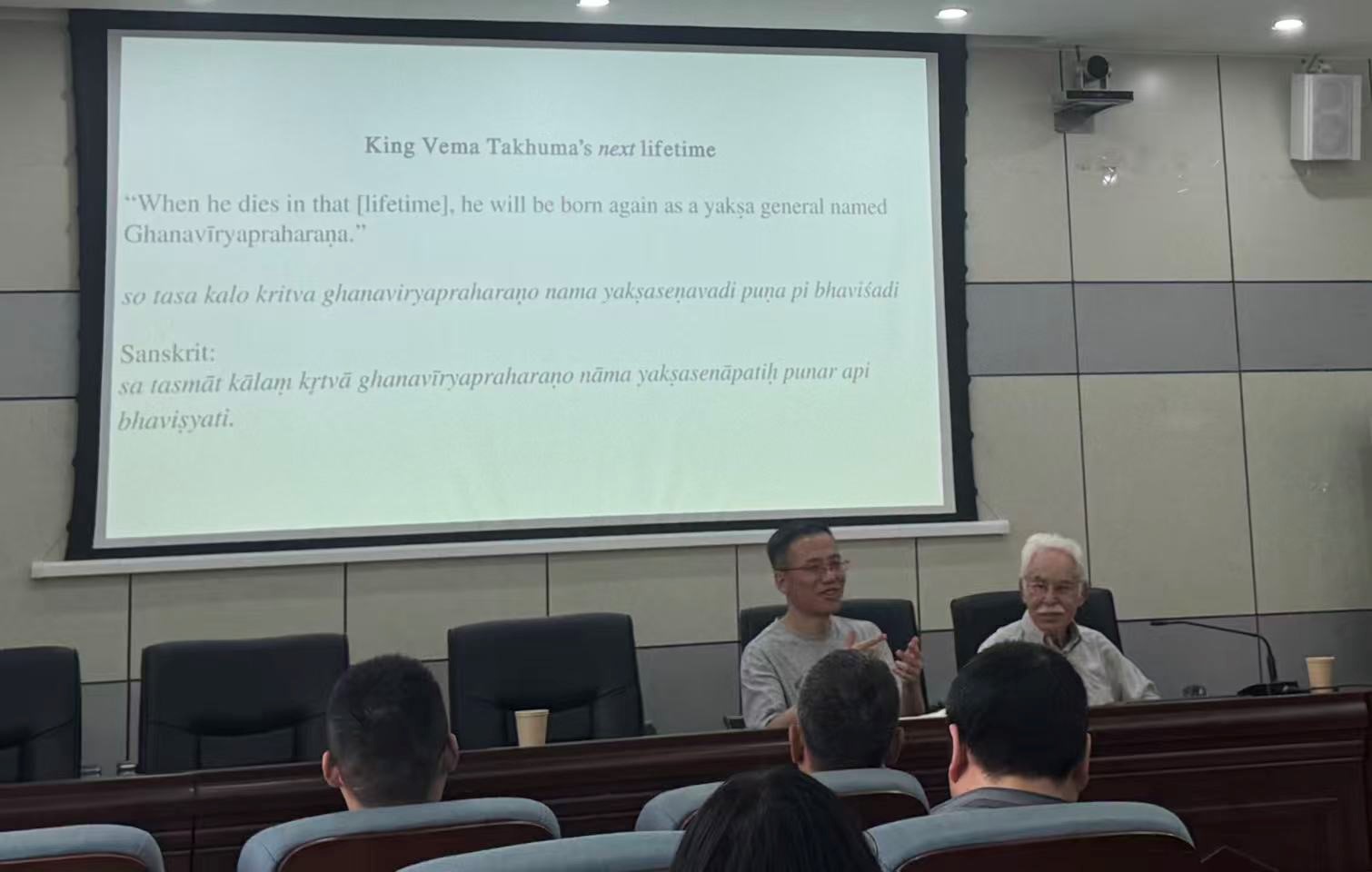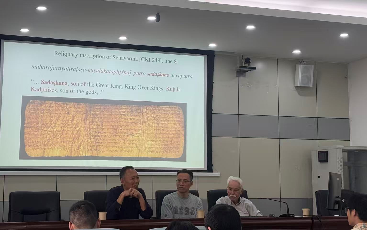 在铺垫上述背景后,邵瑞琪教授开始解读本次讲座的核心文献,即编号为39+40的桦树皮写卷。该写卷使用犍陀罗语、佉卢文书写,年代大致与威玛·塔克图的生活时期同时或略晚。他指出这篇体例罕见的佛经采用了佛教中常见的“授记”形式。经文中,佛陀向一位夜叉大将及其子预言:在佛法末世,该夜叉大将会转生为名叫威玛·塔克图的国王,此后经历多次转世最终成佛;其子同样经历转世最终成佛。写卷第14行左右可释读出“名为威玛·塔克图的国王”之句,经文中并出现“其子将继承其王国”等表述。